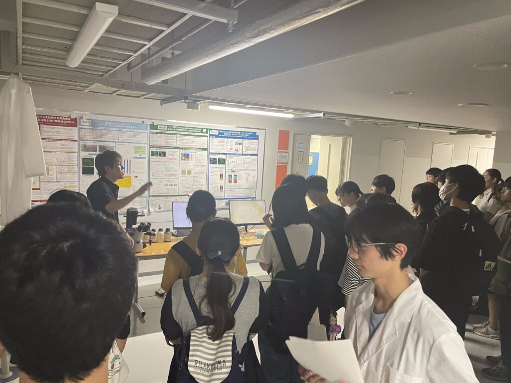 ラボツアーでは「目に見えない微生物を研究するにはどうしたらよいのか」をテーマにラボ内での研究活動について、合計60名の高校生と話をしました。